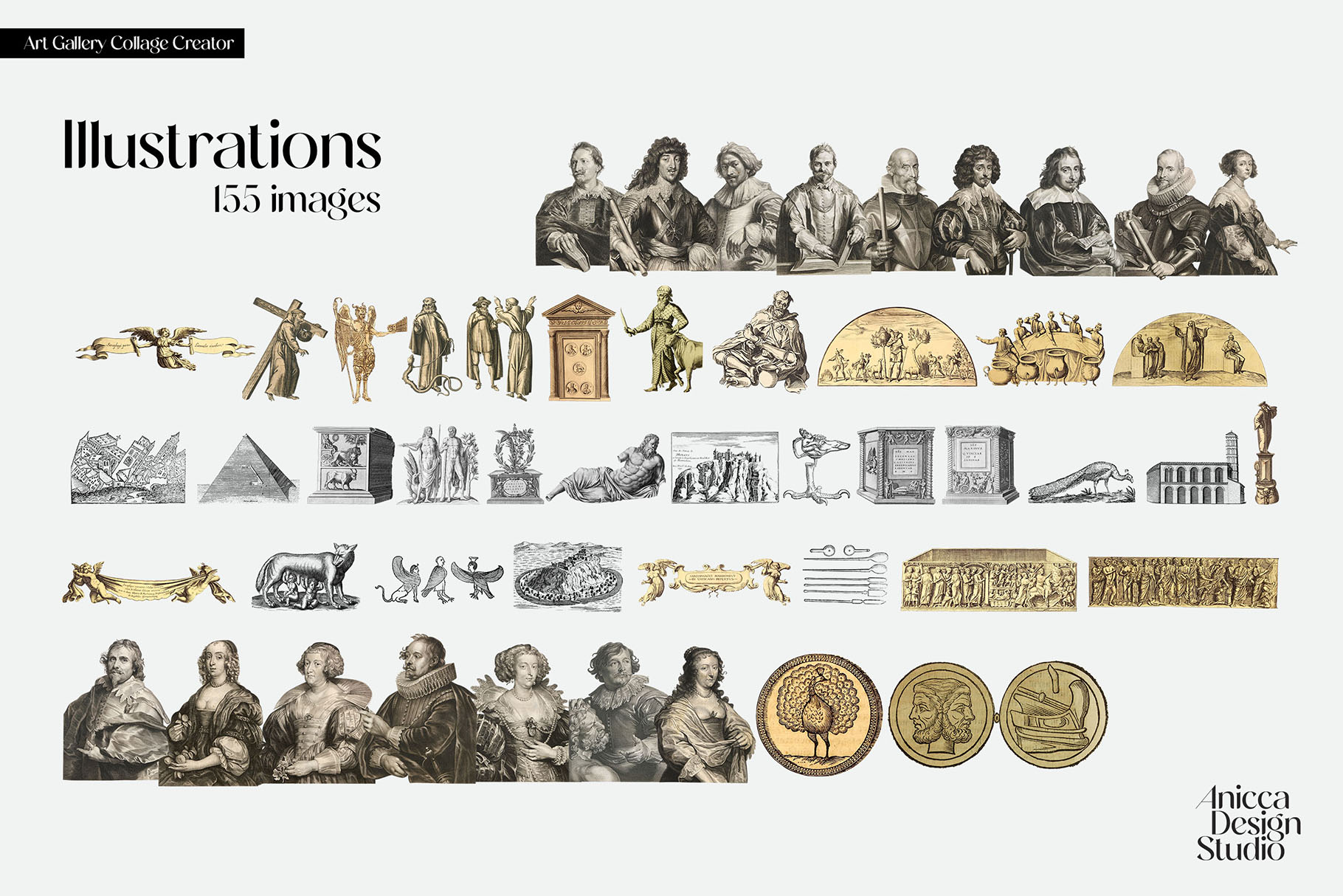The Art Gallery Collage Creator – XVII Century Edition is a collection of hundreds of beautiful images from the XVII century, with isolated background in PNG format, so you can compose outstanding collages by simply dragging and dropping into the image editor of your choice!