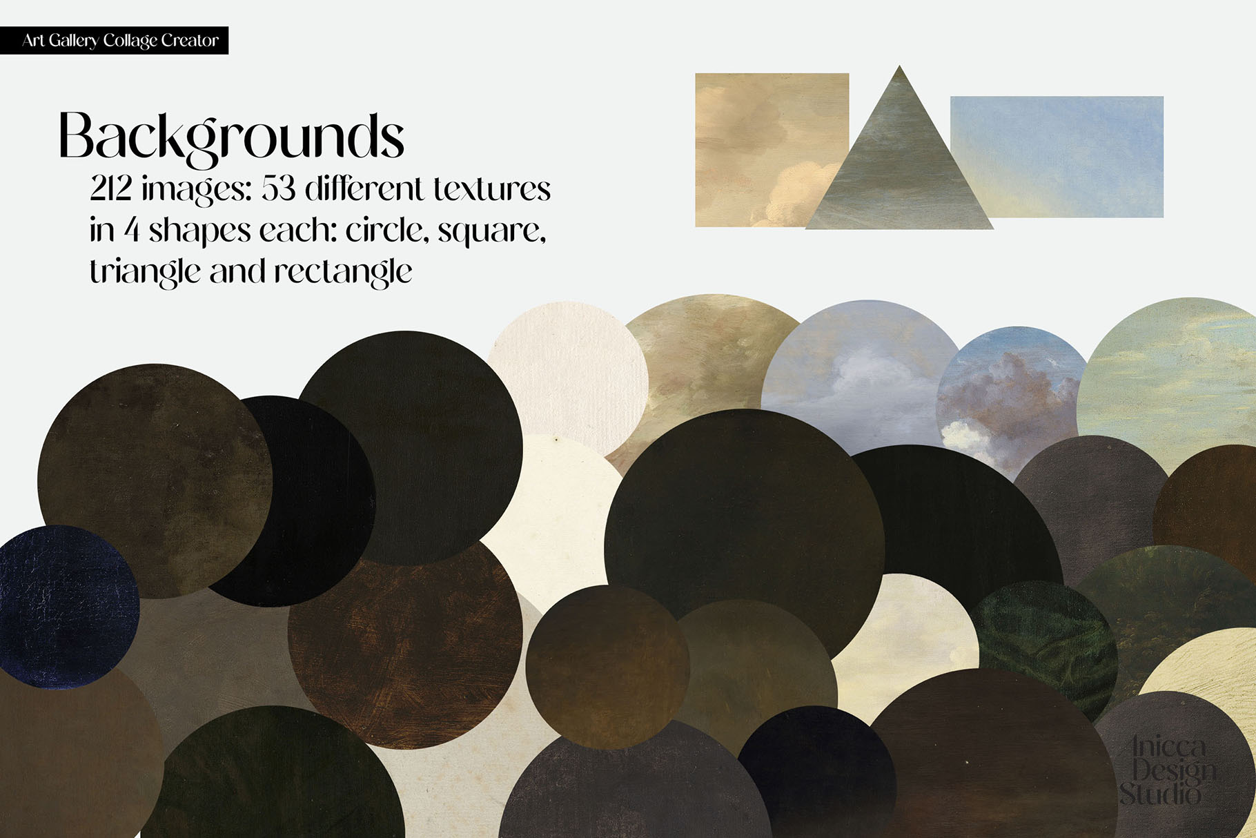 - Backgrounds - 212 images (53 different textures in 4 shapes each: circle, square, triangle and rectangle)